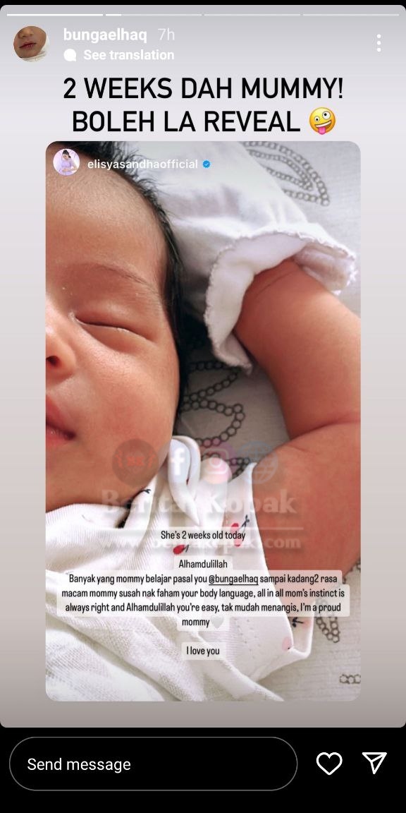 Elisya juga menyatakan bahawa menjaga Bunga tidak begitu sukar kerana Bunga seorang bayi yang tidak mudah men4ngis. Elisya juga amat berbangga dapat bergelar sebagai seorang ibu dan Elisya amat menyayangi Bunga.