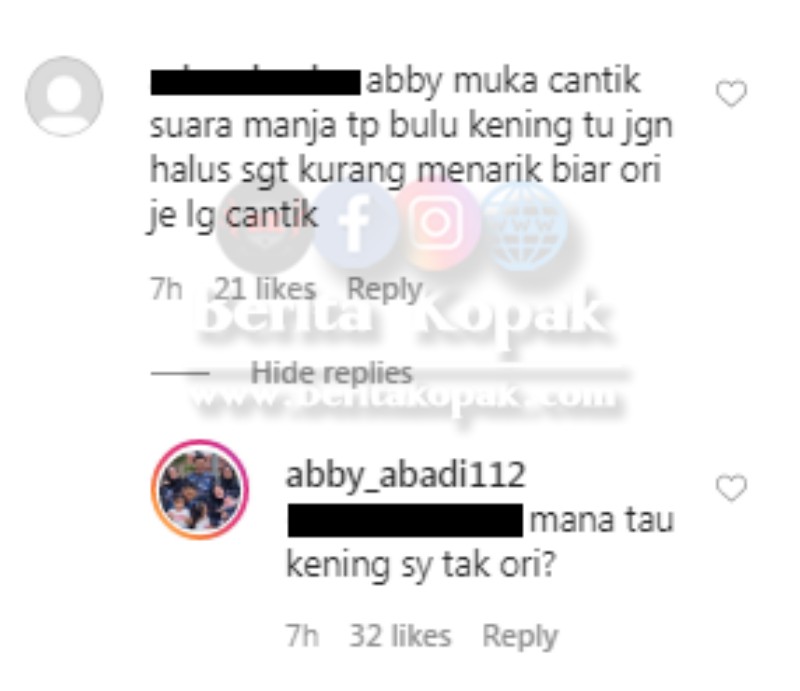 Perkongsian Abby ini menerima satu teguran daripada netizen mempersoalkan tentang rupa kening Abby yang nampak seperti dicuk0r. Abby turut memberi respon kepada komen ini :