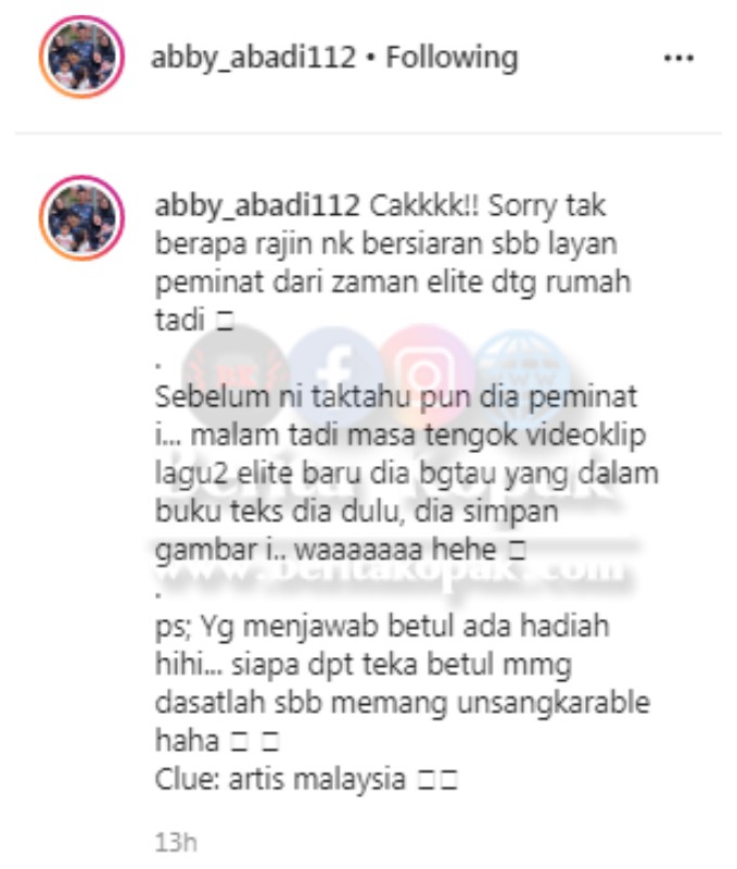 Menerusi akaun Instagram, Abby Abadi telah berkongsikan sekeping gambarnya bersama Daiyan, Dayana dan Darda. Turut sama berkongsi cerita tentang tetamu istimewanya yang merupakan seorang artis negara yang datang berziarah rupanya peminat setia Abby sejak dulu lagi.