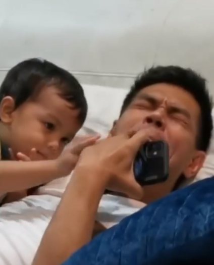 Paling menghiburkan adalah apabila Fauzi cuba untuk mendapatkan semula telefonnya itu dengan membuat-buat bahawa tangannya mahu menggaru dagu yang sedang gat4l. Meskipun alasan yang diberikan oleh Fauzi itu kepada anaknya, dilihat si kecil itu tidak mengendahkan alasan yang diberikan oleh bapanya.