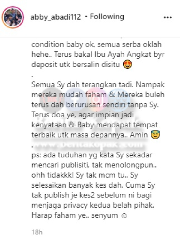 ” Bersabar lah k.Abby dengan mulut2 j4hat tu, semoga k.abby teros sukses dgn perjuangan k.abby demi membela nsib baby yg tak bed0sa ni.. “