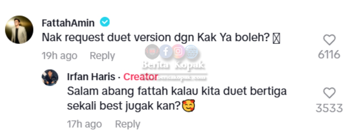 Sedap suara Irfan menyanyikan lagu trademark Fattah ini. Nampaknya bukan hanya warganet yang restu, Irfan pun sepertinya menyambut baik kehadiran Fattah. Jika Irfan, Amira dan Fattah berpadu suara, tentu lagi sedap lagi ini nanti. Moga-moga ada cover mereka bertiga selepas ini.