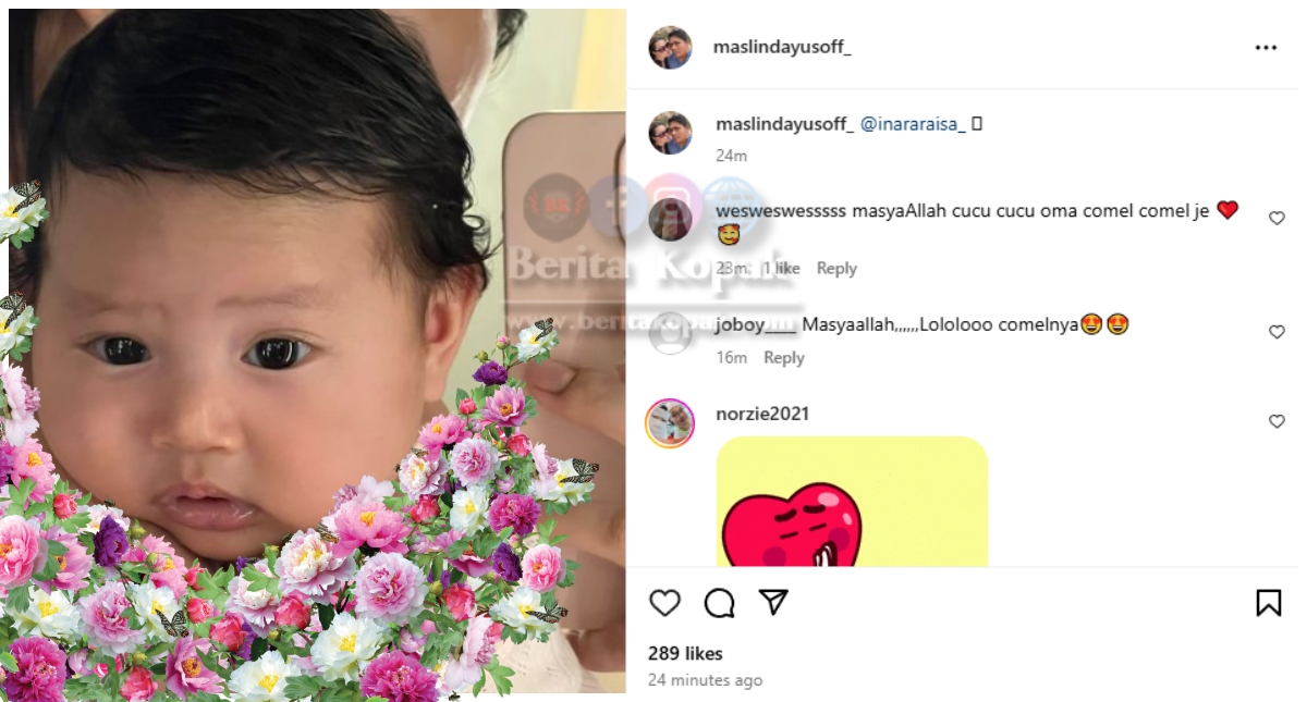 Pendek sahaja kapsyen Maslinda dengan menulis nama Inara Raisa. Melihat wajah Inara itu, ramai yang mengatakan Inara seperti wajah Maslinda. Tidak kurang juga yang melihat wajah Inara itu kelihatan seperti daddynya, Aiman Hakim Ridza.