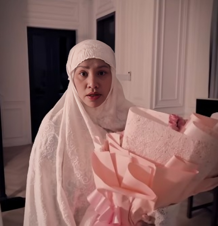 Cikgu Azlan memanggil Elly turun ke ruang makan yang ketika itu Elly baru selesai menunaikan solat. Elly dikejutkan sejambak bunga dan hadiah sepasang telekung. Elly dilihat sebak apabila menerima hadiah dan kejutan sebegini.