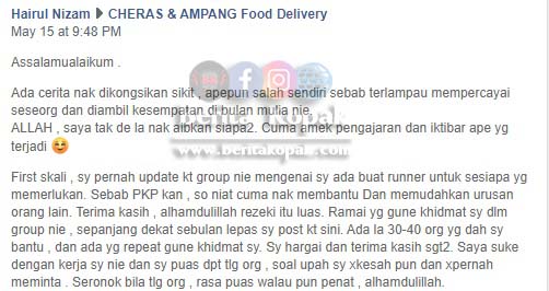 Sumber : Hairul Nizam melalui perkongsiannya di laman CHERAS & AMPANG Food Delivery