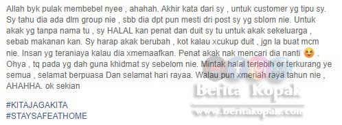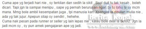 Dapat dilihat ‘Akak’ itu memberitahu yang dia tidak dapat melakukan pembayaran secara 0nline kerana masalah signal. Dan lebih mal4ngnya itu adalah pesanan yang terakhir yang diterima dari akak tersebut selepas Hairul Nizam membeli barang-barang pesanannya.