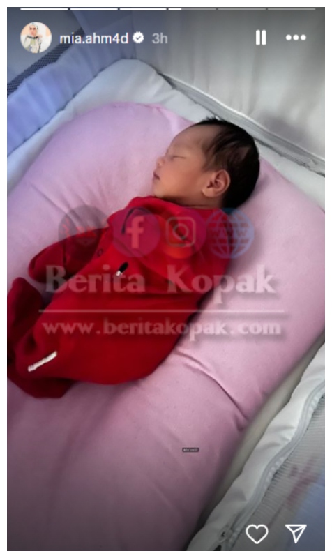 Di Instastory Mia pula, gambar terbaru anak Mia dikongsikan kepada umum. Baby Mia ini dipakaikan dengan baju berwarna merah dan kelihatan begitu comel. Rambutnya yang hitam dan lurus sama seperti kakak-kakaknya juga. Alhamdulillah sudah empat anak Mia dan Izham.