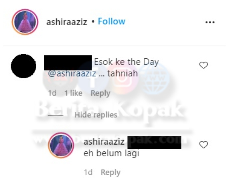 Ashira turut membal4s pada ruangan komen apabila peminatnya bertanya samada esok adalah big daynya ataupun t1dak.