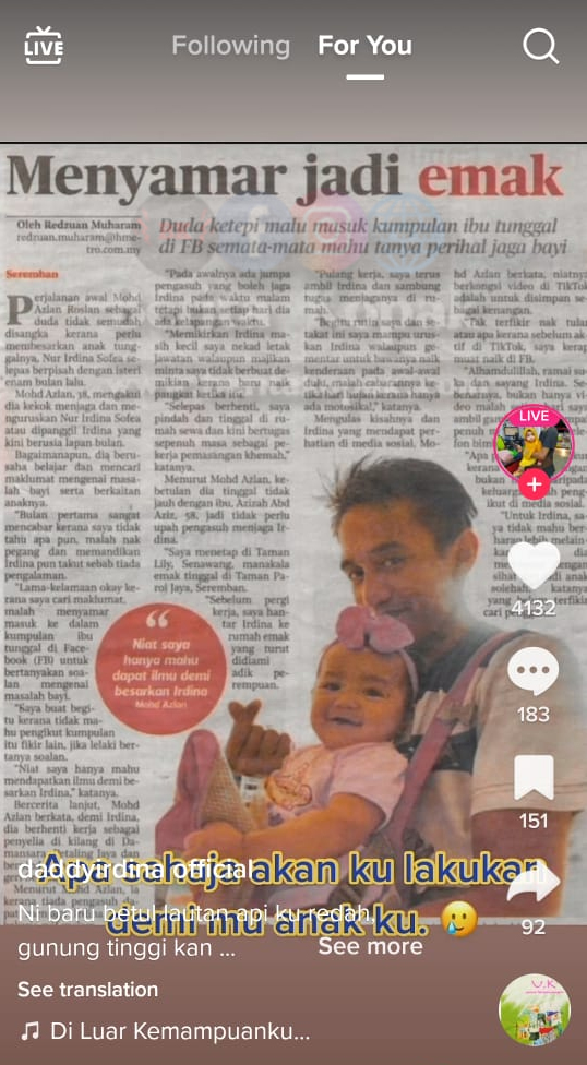 Viral video di akaun Tik T0k daddyirdina22 mengenai seorang duda bersama bayi perempuannya bernama Nur Irdina Sofea. Hidup sebagai single dad dan menjaga anak yang masih kecil bukanlah sesuatu yang mudah dan memerlukan banyak peng0rbanan.