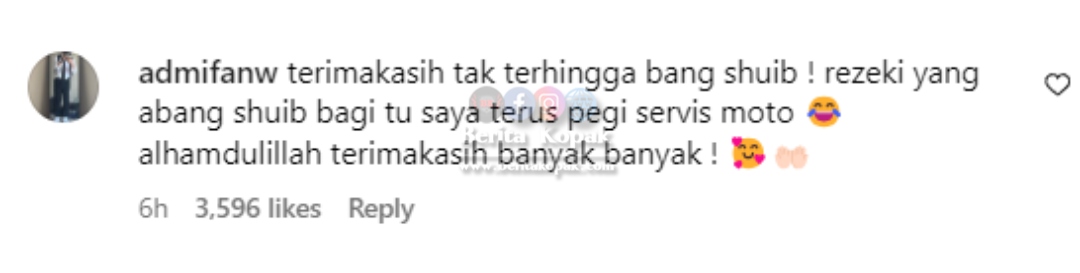 Sebak pula membaca komen rider itu, dapat duit terus pergi servis motor. Nampak dirinya memang seorang yang bersopan santun dan beradab. Tengok sahaja lah selepas dapat duit terus dia peluk dan salam cium tangan Shuib. Apa-apa pun semoga Shuib murah rezeki lagi selepas ini kerana berkongsi rezeki pada bulan ramadan.
