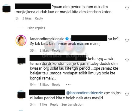 Namun perkongsian Lana ini juga mengundang beberapa persoalan daripada netizen kerana Lana hadir ke masjid dalam keadaan period. Lana turut memberi respon akan komen-komen yang diberikan dan mengaku akan kesilapannya.