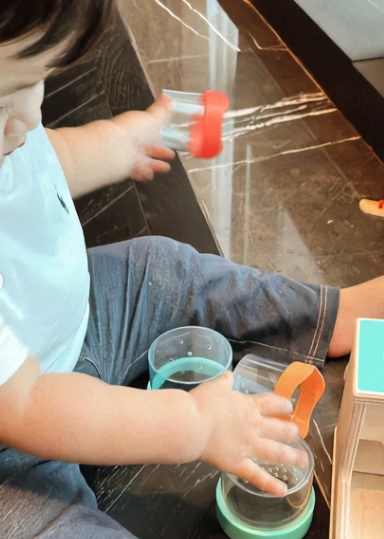 Dalam video ini, dapat dilihat Bilal menyusun mainan cawan mengikut size untuk membentuk cawan yang tinggi. Laju sahaja tangan Bilal mengambil satu persatu cawan mainannya itu. Video seterusnya pula, Bilal memasukkan mainan ke dalam lubang mengikut size lubang yang tersedia.