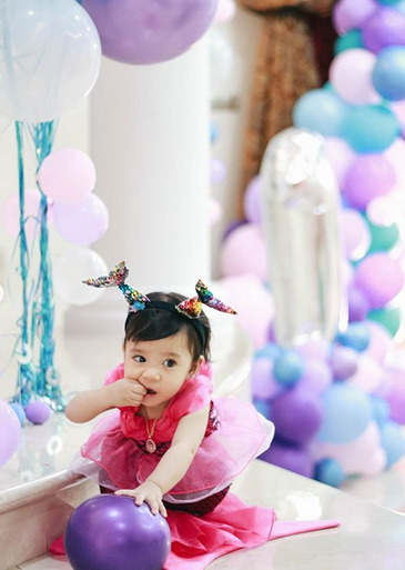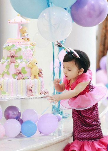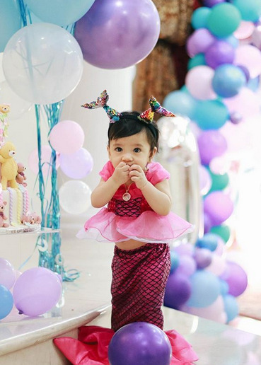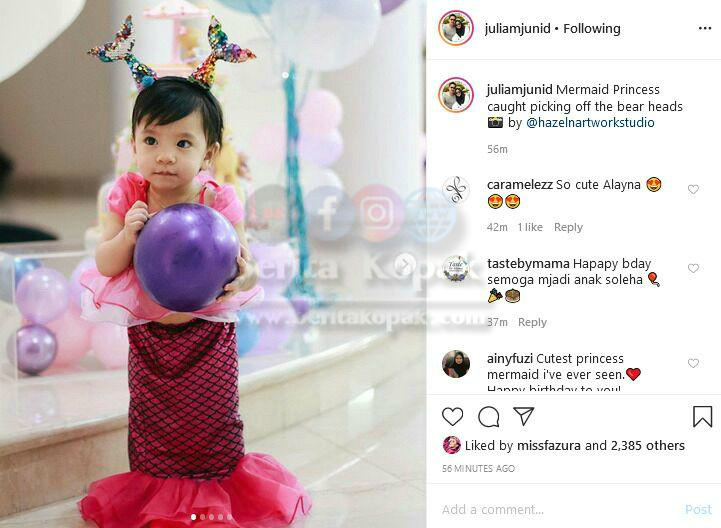 Menerusi akaun Instagram Julia, beberapa gambar sekitar sambutan hari lahir Alayna telah dikongsikan. Bertemakan ikan duyung, Alayna begitu comel sekali dengan kostum ikan duyungnya itu. Alahai, cantiknya kostum Alayna dengan reben ekor duyung !!