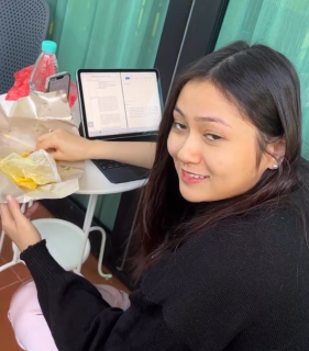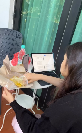 Mengalihkan rakaman kameranya ke luar bilik, dapat dilihat Fazeera sedang menghadap I-pad sambil mencur1 masa untuk makan. Tulis Fizo pada paparan video tersebut mengatakan Fazeera sedang exam untuk semesta akhirnya.