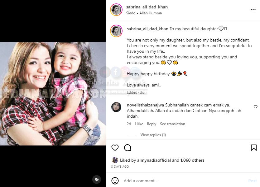 ” Happy birthday beautiful girl.. Wah sabrina_ali_dad_khan dh besar dh your daughter. Happy birthday cantik. Semoga sntiasa dlam lindungan Allah. Dberikan keshtan yg baik dan ceria sellu.. “