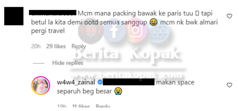 Bahkan ada peminat yang bertanya kepada Wawa bagaimana gaun itu dibawa dan pertanyaan tersebut dijawab oleh Wawa di ruangan komen. Hingga kini video itu telah mendapat lebih 23 ribu tanda suka sejak ia dimuatnaik ke akaun Instagram.