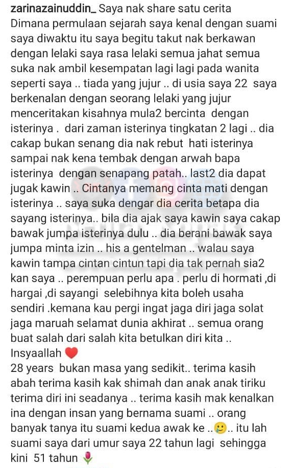 Ramai yang merasa bahagia apabila membaca kisah yang dikongsikan oleh Zarina. Walaupun begitu, tidak semua wanita mahu hidup bermadu. Semoga Zarina Zainuddin terus bahagia bersama keluarga dan sentiasa dimurahkan rezeki. Amin.