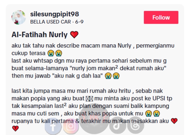 ” Mengalir airmata sy, baiknye arwah.. Tiap kali lalu psl arwah nurly.. Auto mnitis air mata.. suka sgt bca kisah arwah walau pon lalu slalu di fyp sy.. sy tetap akn baca berulang kali… smoge arwah tenang disana amin2.. ”