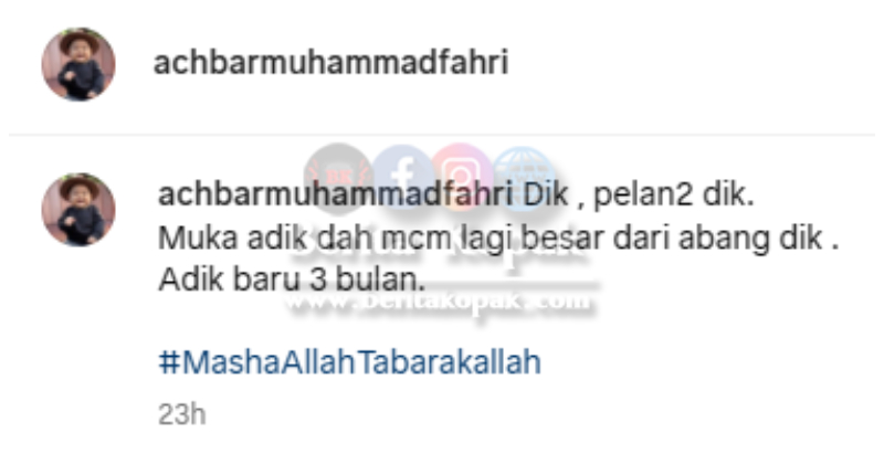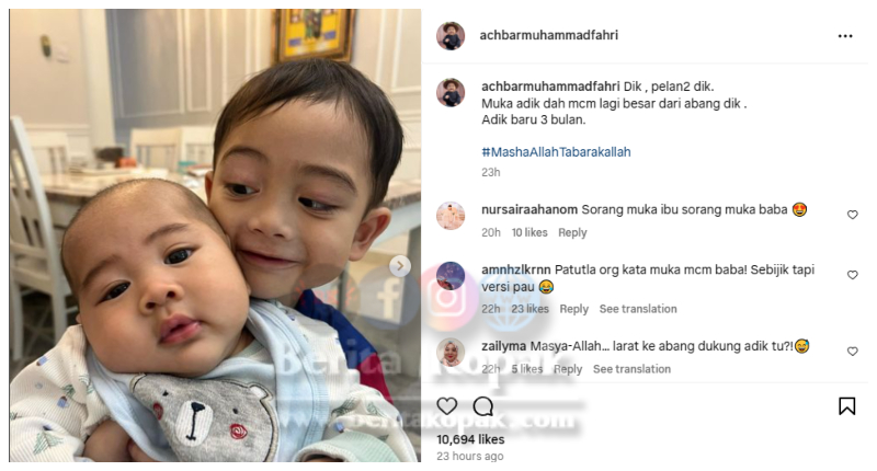 Meninjau akaun Instagram Achbar Muhammad Fahri, telah dikongsikan beberapa keping gambar terbaru Fahri bersama Fayyadh. Di ruangan kapsyen tertulis ‘ Dik , pelan-pelan dik. Muka adik dah macam lagi besar dari abang dik. Adik baru 3 bulan’.