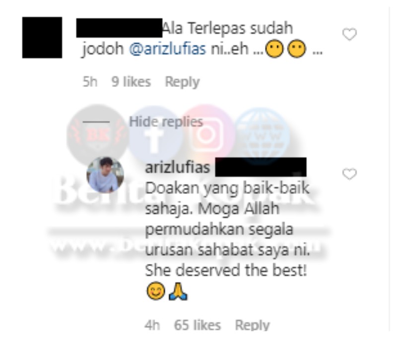 Namun ada juga komen daripada peminat yang mengaitkan nama Ariz dan dibalas Ariz dengan ucapan doa yang sangat ikhlas untuk sahabatnya itu.