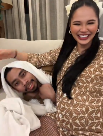 Kepala Amirul ditutup dengan kain berwarna putih dan di atas riba Ain pula diletakkan kain seakan-akan badan bayi yang sudah dibedung. Ia membuatkannya kelihatan seperti Ain sedang meriba baby yang berwajah Amirul. Terbahak semua ketawa melihat gelagat Amirul dan Ain itu.
