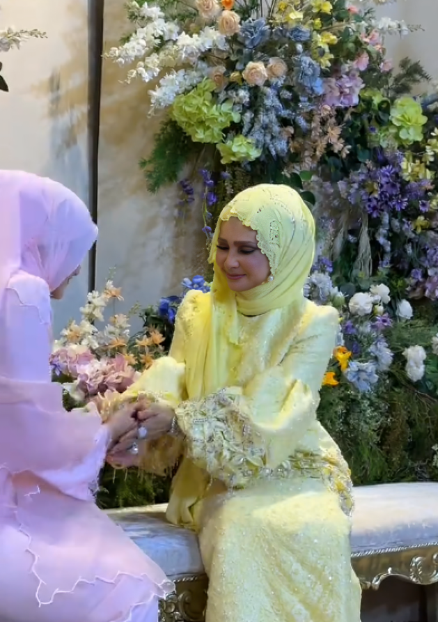 Busana serba kuning menjadi pilihan Che Ta sekeluarga dan Che Ta kelihatan sangat menawan. Moment ketika Che Ta menyarungkan cincin ke jari bakal menantunya itu juga turut dikongsikan. Demi menjaga privasi bakal menantu Che Ta, video ini lebih banyak difokuskan ke arah Che Ta.