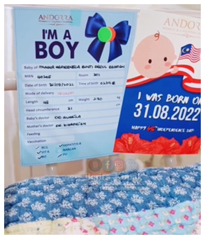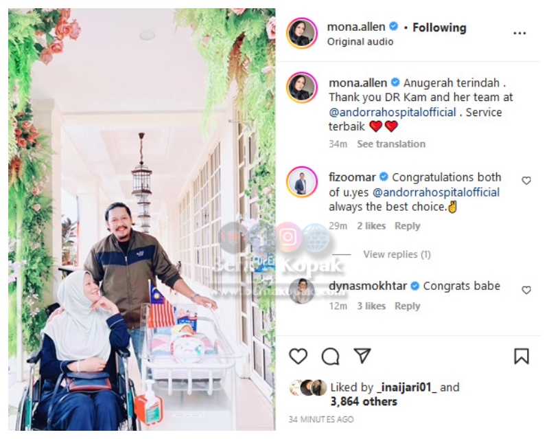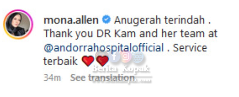 Memilih Andorra Women & Children Hospital sebagai hospital bersalin, Dr Kam selaku doktor pakar di situ membantu Mona untuk proses bersalinnya ini. Tulis Mona di ruangan kapsyennya, ucapan terima kasih untuk Dr Kam dan semua team atas khidmat terbaik mereka.