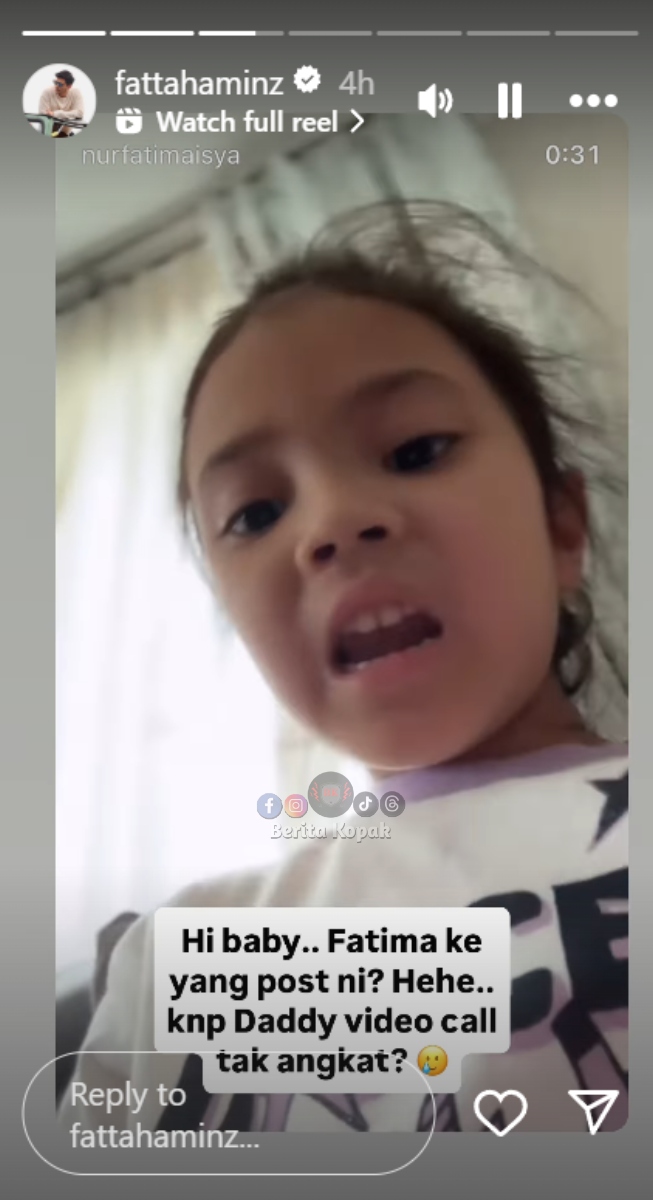Manakala di ruangan kapsyen, telah ditulis ‘Dear daddy’ berserta dengan emoji love berwarna biru dan diakhiri dengan ‘ Love Fatima ‘ beserta emoji love berwarna merah jambu. Selain itu, Fattah turut memberikan respon kepada video Fatima itu menerusi Instagram Story miliknya.