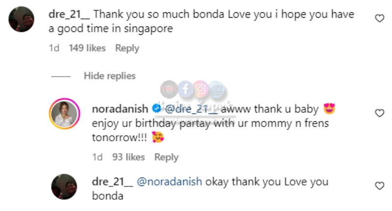 Di ruangan komen, selain menyukai perkongsian oleh Nora, ramai yang memberikan kata ucapan selamat hari lahir kepada Dre. Antara komen-komen tersebut adalah :