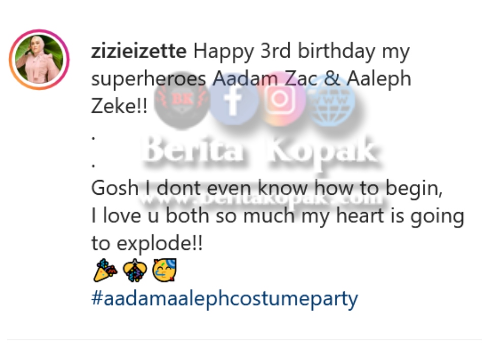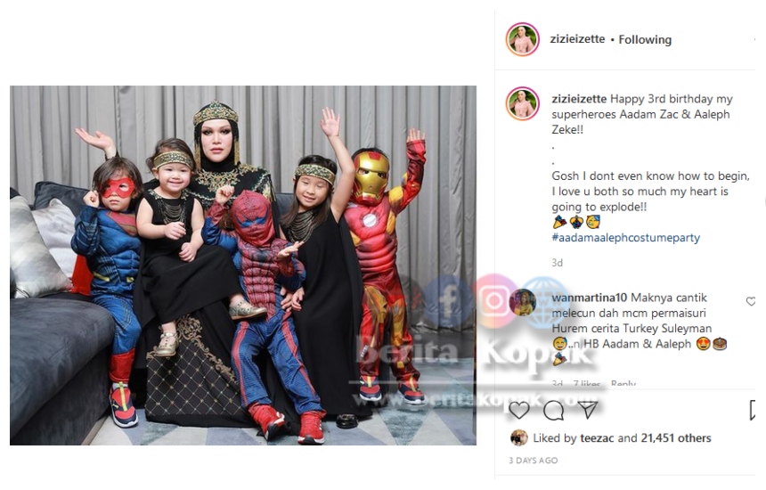 Terbaru di ruangan Instagram miliknya, Zizie berkongsi gambar anak-anaknya yang memakai kostum superhero. Costume party ini diadakan bersempena menyambut ulang tahun kelahiran si kembar Aadam dan Aaleph yang ke-3 tahun. Semuanya nampak comel dan bergaya dengan pakaian masing-masing.