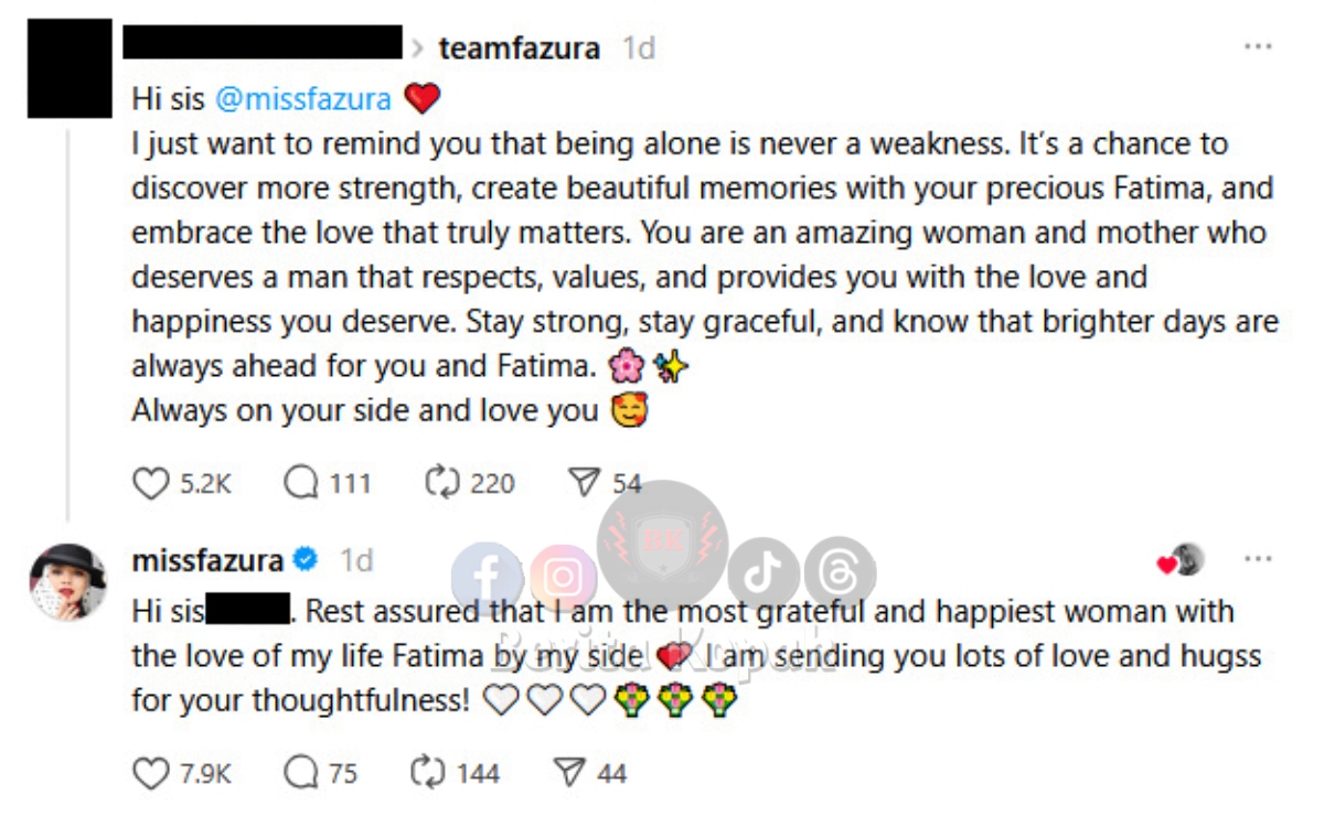 ” Thank you so much Kak Faz, your reply truly means the world to me. You are such an inspiration to so many women out there strong, graceful, and always carrying yourself with kindness. The love that you share with Fatima is so pure and beautiful, it radiates strength and hope for all mothers and daughters. I truly believe Allah has written the most beautiful journey for both of you, and may every step ahead be filled with protection, endless happiness, and love that heals every wound.. “