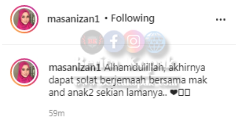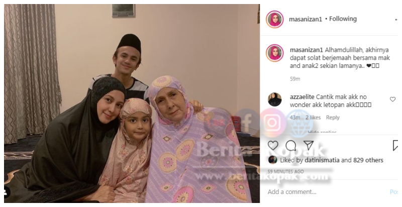 Meninjau akaun Instagram Mas Anizan, telah dikongsikan sekeping gambar Mas bersama anak-anak dan juga ibunya. Mas Anizan turut menulis di kapsyennya rasa syukur kerana dapat mengerjakan solat berjemaah bersama mak dan anak-anaknya itu setelah sekian lama.