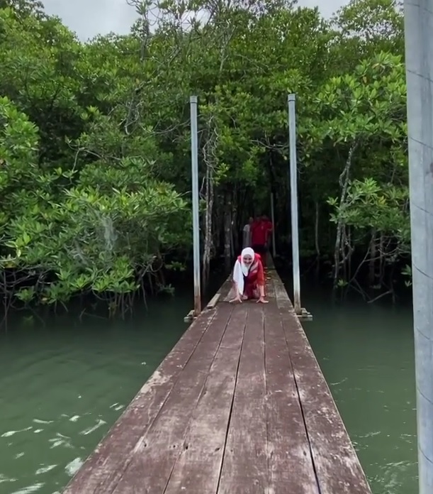 Situasi Azza menjadi bahan jen4ka kawan-kawannya. Kedengaran suara yang merakamkan video itu berkata sesuatu kepada Azza sambil ketawa berdek4h apabila melihat Azza merangk4k ketika meniti jambatan kayu tersebut. Jelas di raut wajah Azza perasaan tak0t. Azza turut sama ketawa dengan keadaan dirinya itu.
