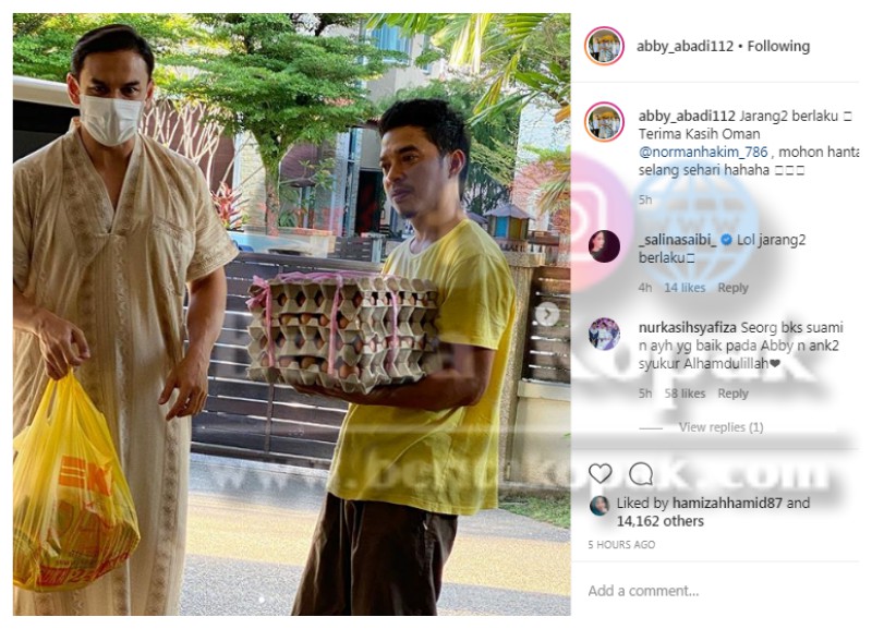 Menerusi akaun Instagram, Abby Abadi telah berkongsikan gambar suaminya Mohd Faizal sedang menerima barangan dapur antaranya telur dan roti daripada Norman. Sikap prihatin dan keakraban keluarga Norman dan Abby buat ramai yang terharu.