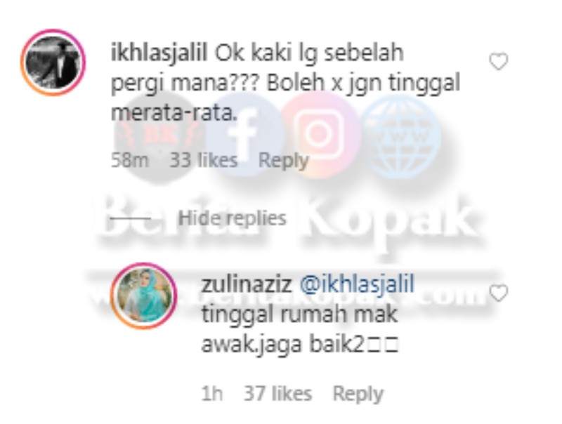 Namun terselit komen daripada ‘teman tapi mesra’ Zulin, Ikhlas Jalil yang bertanyakan tentang penampakan kaki yang kelihatan sebelah sahaja. Jawapan Zulin buat peminat teruja. Wahhh ayat orang sedang bahagia ni.