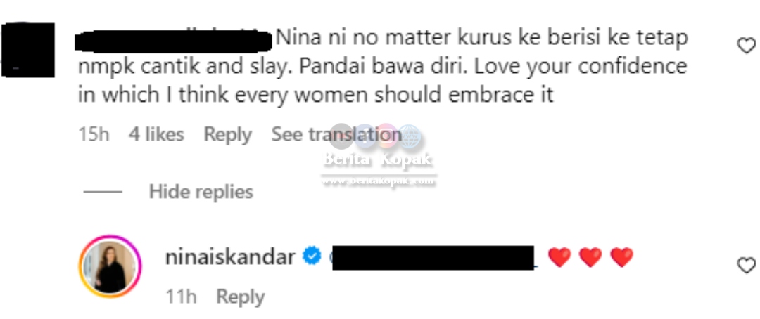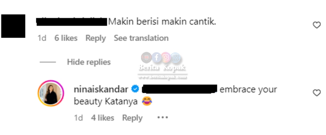 Di ruangan komen, ramai yang menyukai perkongsian oleh Nina dan memuji penampilan Nina sekarang. Antara komen-komen menarik daripada warganet adalah :