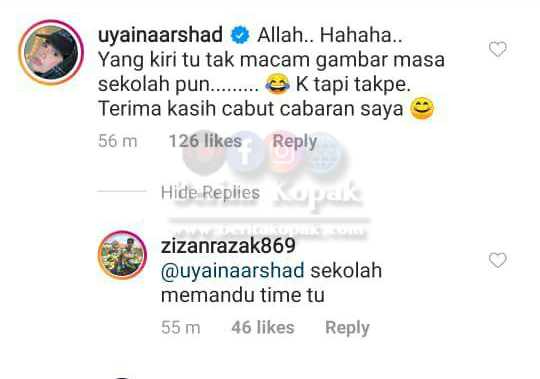 Manakala komen dari Uyaina pula yang mempersoalkan wajah Zizan di sebelah kiri tidak kelihatan seperti bud4k. Respon Zizan kelakar sangat.