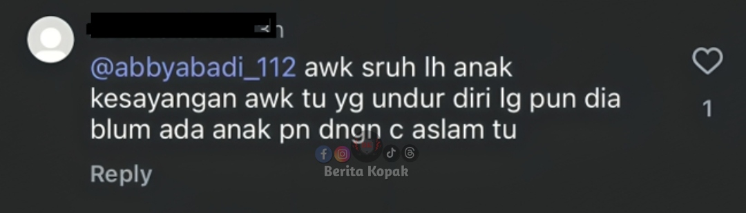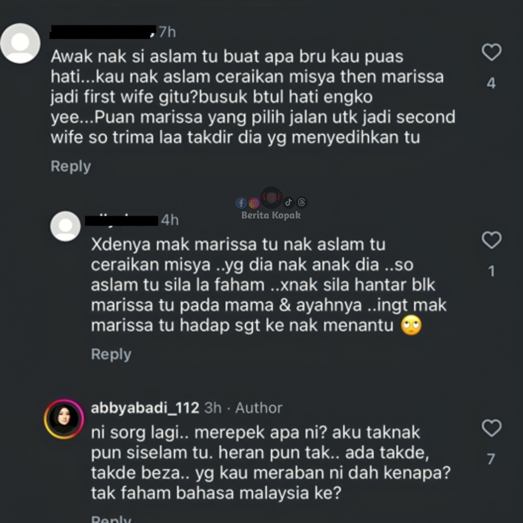 Hal ini kerana, penulis komen itu beranggapan yang Abby mahu Aslam untuk menceraikan isteri pertamanya dan mahu Marissa menjadi isteri tunggal. Komen itu turut dibalas oleh Abby dan mengatakan orang tersebut tidak faham apa yang dikongsikannya itu.