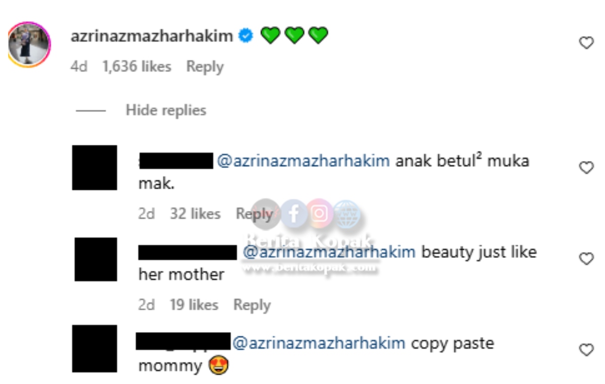 ” Kecantikan puteri Melayu. Cantik seperti ibunya, Azrinaz.. ” – Komen Netizen