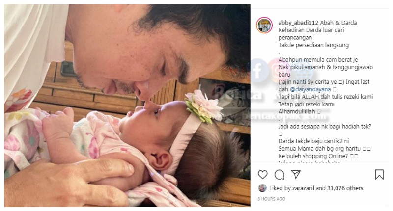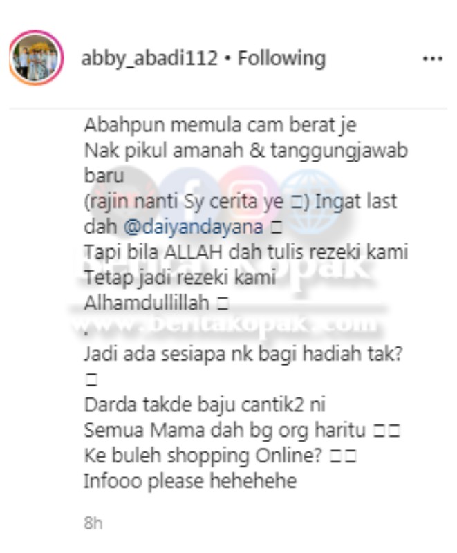 Sesungguhnya Allah sebaik-baik pengatur. Moga rezeki Abby sekeluarga sentiasa dipermudahkan dan moga kehadiran Darda menambahkan lagi pintu rezeki buat keluarga bahagia ini. Kami di Berita Kopak mendoakan semoga Darda membesar dengan sempurna dan menjadi anak yang berguna buat mama Abby dan Abah Jai. Aamin..