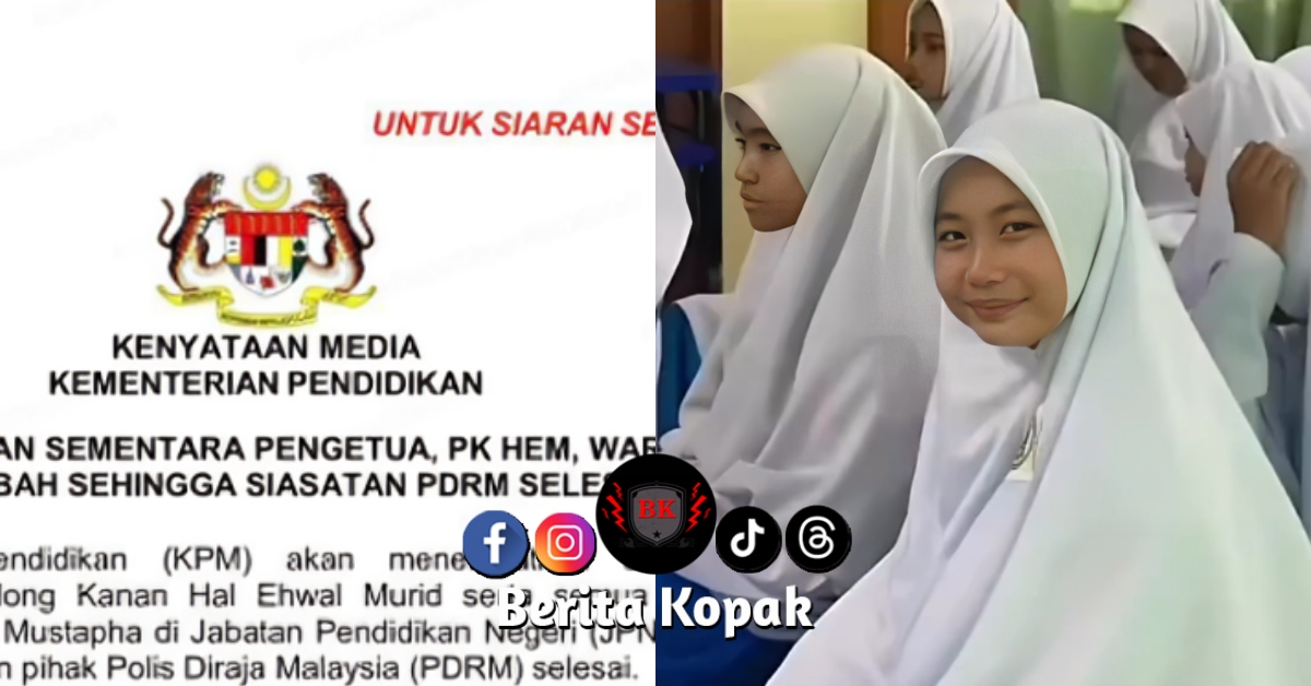Menerusi perkongsian terkini di akaun Facebook Ustazah Marhamah Rosli, telah dikongsikan satu gambar yang memaparkan surat kenyataan media Kementerian Pendidikan yang dikeluarkan sebentar tadi. Ianya mengenai Pengetua, PK Hem dan semua warden SMKA Tun Datu Mustapha yang direhatkan dan ditempatkan ke penempatan lain sementara siasatan sedang dijalankan oleh pihak Polis Diraja Malaysia.