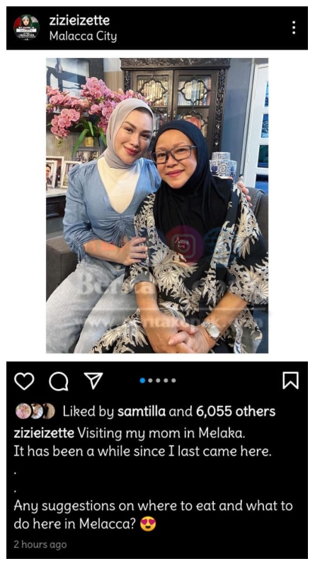 Anak-anak seperti biasa akan mengikuti ke mana sahaja Datin Zizie pergi. Sedondon sahaja anak-anak dan si ibu memakai baju berwarna biru kesemuanya. Tulis Datin Zizie, sudah lama dia tidak pulang ke Melaka dan bertanya kepada peminat tempat makan yang sedap di bumi Hang Tuah ini.