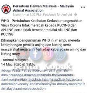 ” Semalam aku ada baca, WH0 – pertubuhan kesihatan sedunia mengesahkan v1rus c0r0na tidak mereb4k kepada kucing dan an1ng. Serta tidak terseb4r melalui kucing dan anj1ng. Aku baca kt page persatuan haiwan malaysia.. “