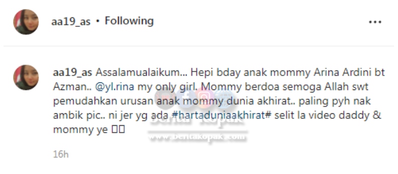 Meninjau akaun Instagram As Muhamad, telah dikongsikan satu ucapan khas buat anak perempuannya bernama Arina Ardini. Satu-satunya puteri yang dimiliki oleh As ini menyambut ulangtahun kelahiran yang ke 15 tahun.
