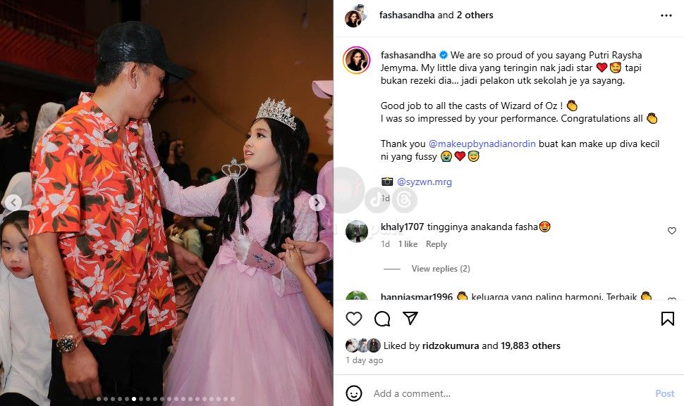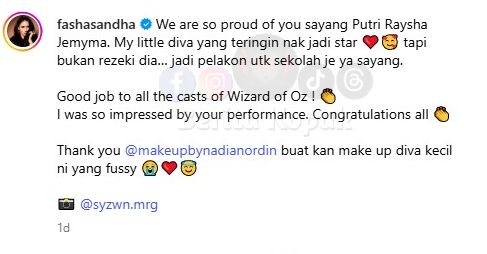 Meninjau ke akaun Instagram Fasha Sandha, posting terbaru Fasha yang memaparkan anak keduanya iaitu Putri Raysha Jemyma telah meraih perhatian ramai. Fasha berkongsi aktiviti anaknya di sekolah yang terlibat dengan persembahan.