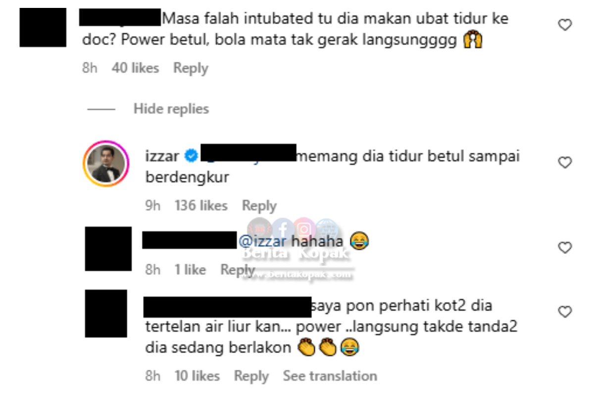 ” Masa Falah intubated tu, dia makan ubat tidur ke doc ? Power betul, bola mata tak gerak langsung.. ” – Komen Netizen