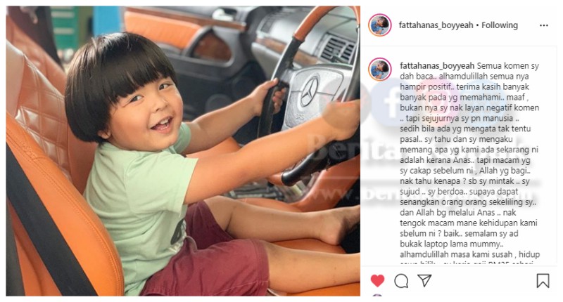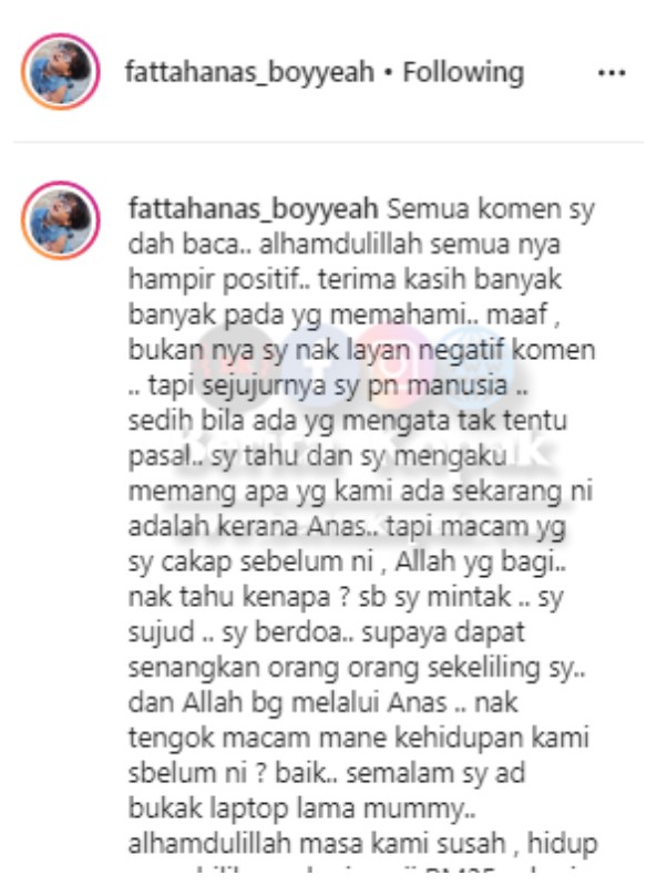 Menerusi akaun Instagram Fattah Anas, telah dikongsikan satu lagi luahan hati Papa Anas setelah beliau membaca semue komen pada posting terdahulu. Papa Anas yang turut berkongsi kisah ketika sus4h dahulu turut mengakui pernah terkena kej0tan budaya namun sudahpun menyedari kes1lapan itu turut memberi tip untuk dimurahkan rezeki.