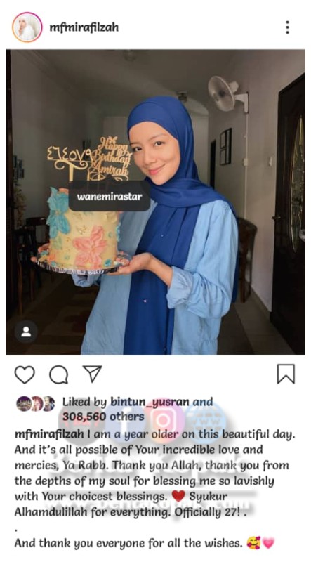 Menerusi akaun Instagram, Mira Filzah yang menyambut ulangtahun kelahirannya yang ke 27 hari ini telah berkongsikan sekeping gambar bersama sebutir kek yang sangat unik. Tertera namanya bersama nombor dalam tulisan jawi, ia menjadi tanda tanya peminat. Namun tindakan Mira men’tag’ nama Wan Emir di postingnya itu semakin menguatkan kh4bar angin tentang berita perkahwinan mereka.