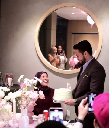 Kelihatan majlis tersebut dimeriahkan dengan belon berwarna pink dan putih serta bunga-bungaan segar di atas meja. Selepas itu, turut kelihatan Nik Iruwan membawa sebiji kek hari lahir kepada Nabila dan menyuap sepotong kek kepada Nabila.