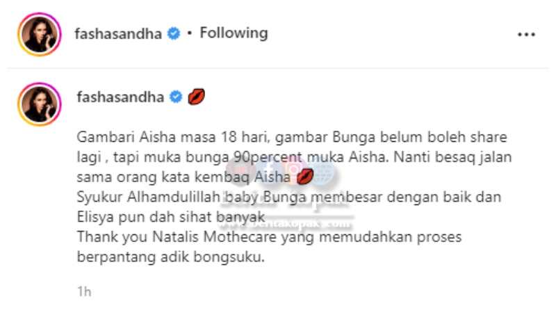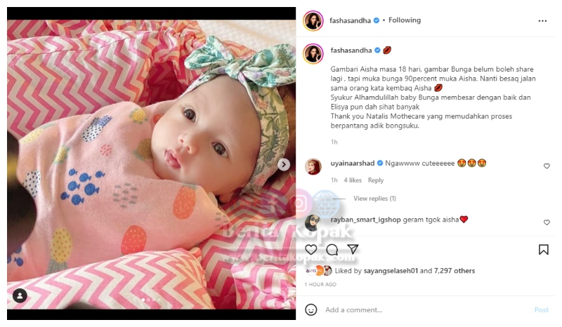 Pada gambar pertama, gambar thr0wback Aisha ketika berusia 18 hari dimuatnaik. Kata Fasha di kapsyennya, gambar Bunga masih belum boleh dikongsikan lagi untuk umum tetapi Bunga 90 percent seperti wajah Aisha ketika bayi.